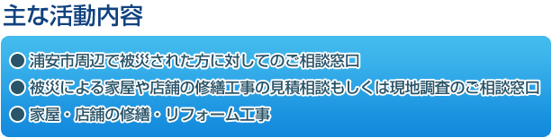 今回、「浦安市復興支援サイト」を開設し、浦安市周辺地域で震災によるお困りごとの相談や、 住みにくくなってしまった家屋・利用しにくくなった店舗の修繕やリフォームをおこなうことで、 少しでも皆様のお力になれればと考えております。